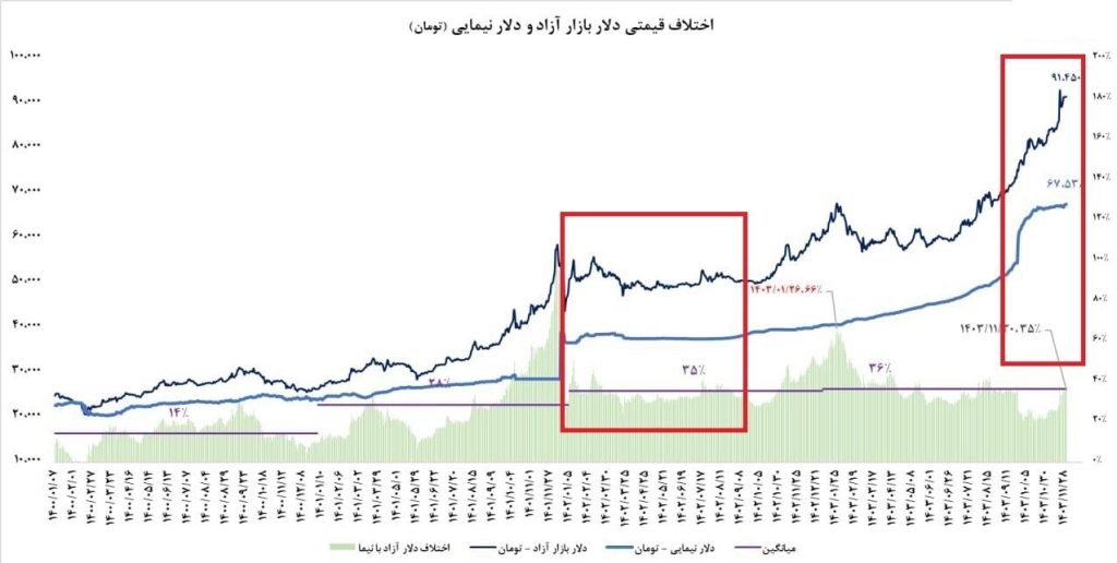 لازم به ذکر است اختلاف میان دلار نیمایی (یا همان توافقی) و بازار آزاد در حال حاضر به 35% بازگشته است. در یک ماه گذشته رشد 13% داشته است و در پایان بهمن‌ماه به 35% رسیده است و این در حالی است که پایان دی‌ماه این عدد حوالی 22% بوده است!